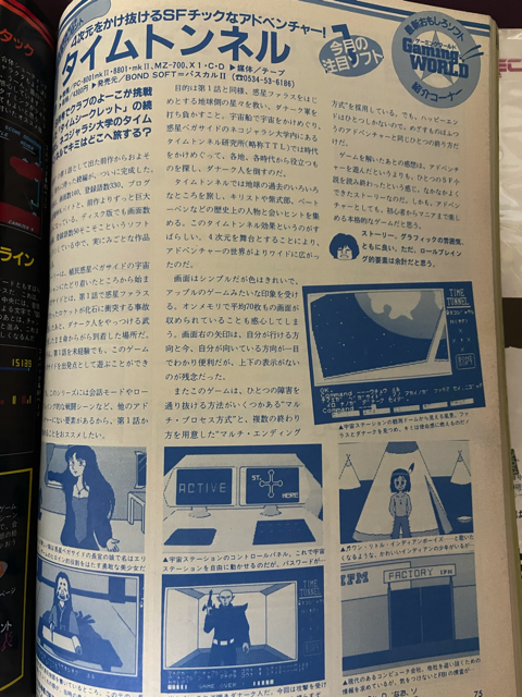 毎度のごとく、手堅いレビューを掲載している、小学館発行のポプコム。1984年12月号に掲載された記事は見開き2ページ。ゲームの核心部分には触れずに、見た目などで「面白そう」と思わせる記事ですね。「画面が動く」とありますが、我がP6版では動かず。。ただ、「画面が動く」と書かれた画面はタイムトンネルではなく、ベガサイドのチューブロード内の画面に見えますが、果たして真相は?88版ですかね?プレイしたことがある方、ぜひ情報をお寄せください!